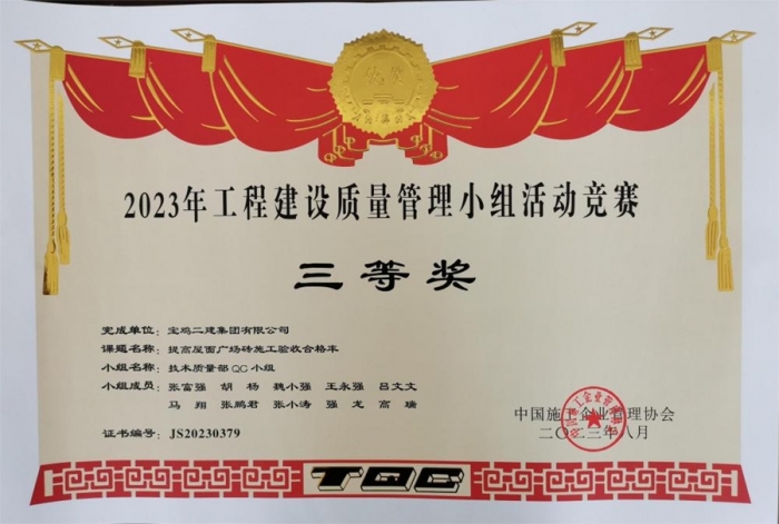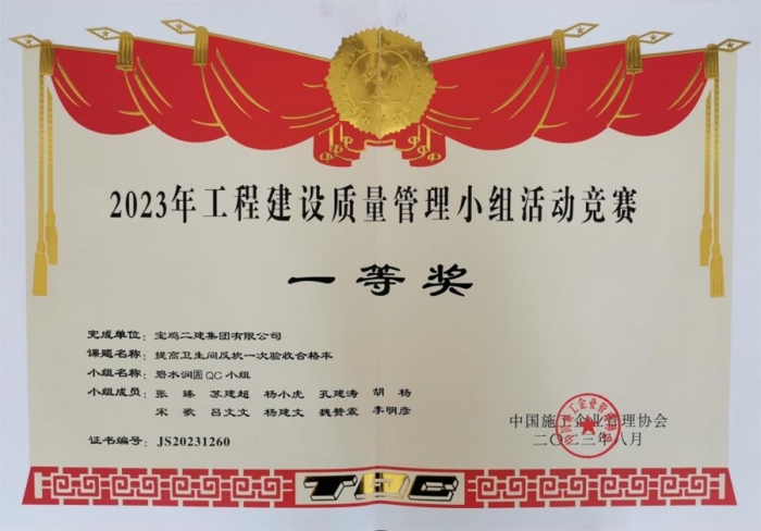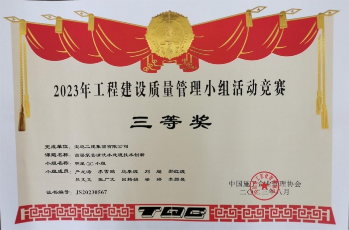 最終,碧水潤園QC小組“提高衛(wèi)生間反坎一次驗收合格率”榮獲2023年工程建設質(zhì)量管理小組活動競賽一等獎,技術(shù)質(zhì)量部QC小組“提高屋面廣場磚施工驗收合格率”榮獲2023年工程建設質(zhì)量管理小組活動競賽三等獎,明星QC小組“高層泵管清洗水處理技術(shù)創(chuàng)新”榮獲2023年工程建設質(zhì)量管理小組活動競賽三等獎。